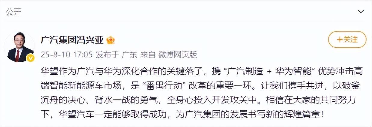 8月9日,广汽董事长冯兴亚在微博上为华望项目打气,表示华望汽车一定能够取得成功。