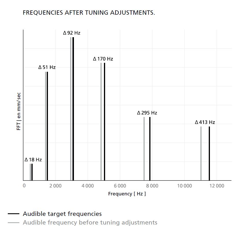 通过激光振动频率测试,四枚音簧被逐一校准,其音准误差被严格控制在±1–5音分的专业级区间。这一标准,已经达到专业演奏级乐器的严苛标准,使报时不再依赖人耳判断,而是建立在可重复、可验证的数据基础之上。