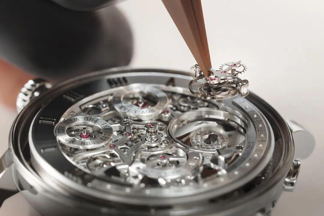 在机芯结构上,这枚作品由1枚主夹板与26枚桥板构成,辅以148处手工内角与3484个珍珠纹打磨细节。这样的修饰并非单纯的美学展示,而是确保结构边缘干净、应力分布稳定,为复杂系统的长期运行提供基础条件。打磨在这里不仅影响观感,也直接关系到机械稳定性与声音表现。
