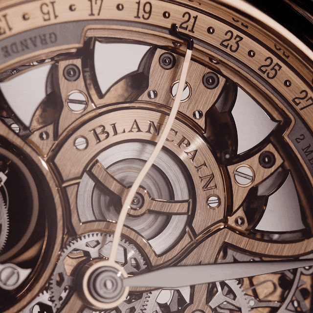 宝珀标志性浮动式飞鸟陀飞轮同样被纳入这一结构体系之中,其存在并非独立展示,而是与报时系统共同构成整枚腕表的核心机械层级。通过这种整体化协同,“大音乐家”在容纳多项超复杂功能的同时,仍将整体尺寸控制在直径47毫米、厚度14.5毫米的可佩戴范围内,使复杂不以牺牲使用性为代价。
